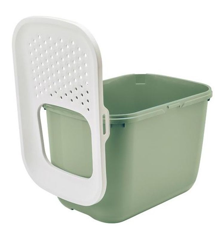 På det vita locket till kattlådan finns perforerade hål, samt högre kanter som lutar inåt. När katten hoppar ur kattlådan landar den på det vita taket och där faller sanden från tassarna tillbaka ner i lådan.