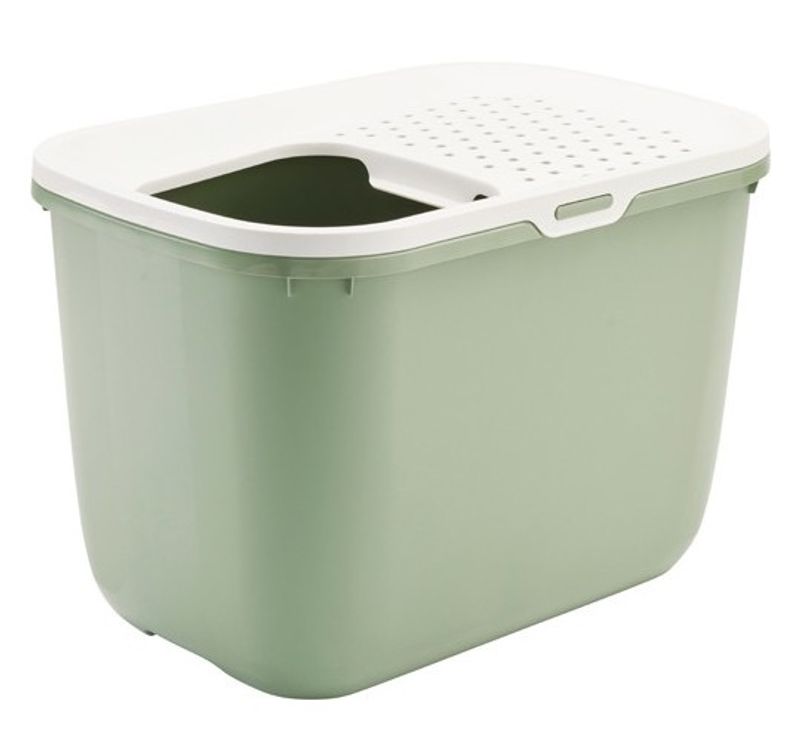 Denna låda är perfekt om man har hundar eller små barn i hemmet då ingången på taket gör det lite knepigare för hund/barn att komma åt innehållet i kattlådan.