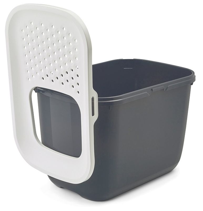 En smart funktion med Hop In är det perforerade, lätt sluttande locket till kattlådan. När katten hoppar upp ur kattlådan och går över locket faller kattsanden ner genom de små hålen i locket och bidrar till att man har mycket mindre kattsand på golvet. Den stora öppningen i locket gör det enkelt för din katt att hoppa ner i kattlådan, Hop In passar även bra för större katter.