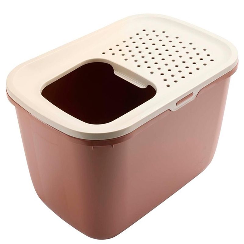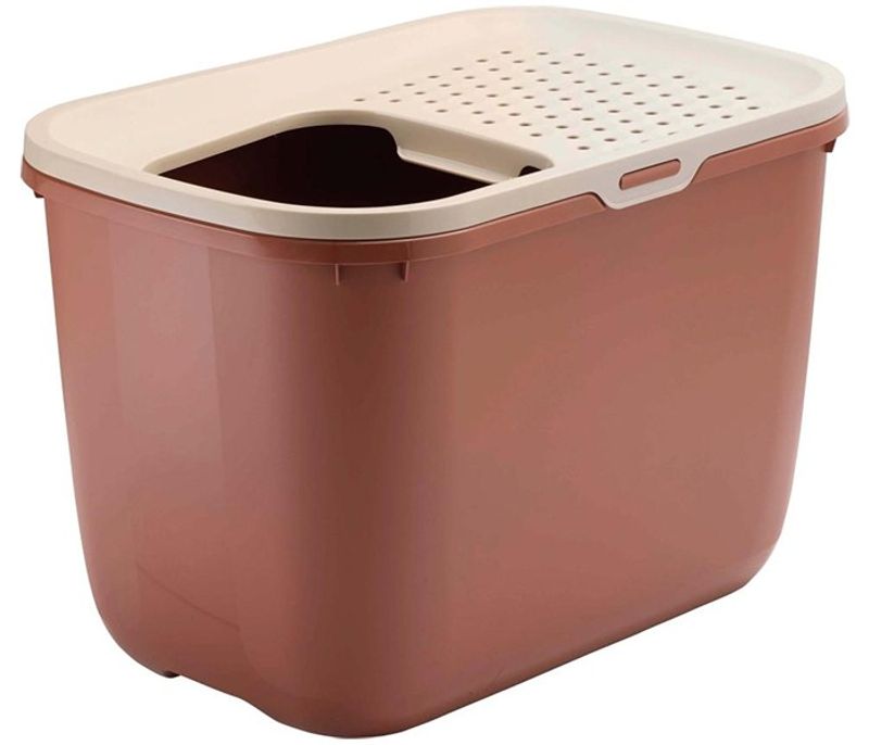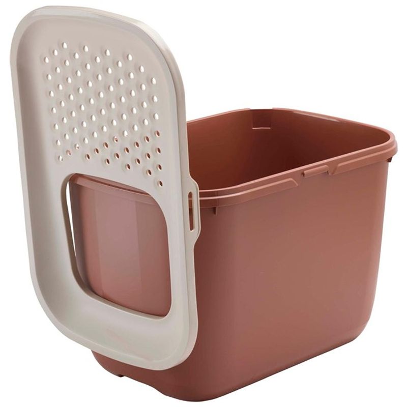 En smart funktion med Hop In är det perforerade, lätt sluttande locket till kattlådan. När katten hoppar upp ur kattlådan och går över locket faller kattsanden ner genom de små hålen i locket och bidrar till att man har mycket mindre kattsand på golvet. Den stora öppningen i locket gör det enkelt för din katt att hoppa ner i kattlådan, Hop In passar även bra för större katter.