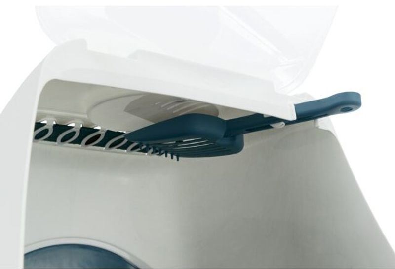 Produktbild 3 och 4 visar medföljande spade och kolfilter, samt hur fronten kan öppnas på denna kattlåda. (Dessa 2 produktbilder visar dock inte produktens korrekta färg).