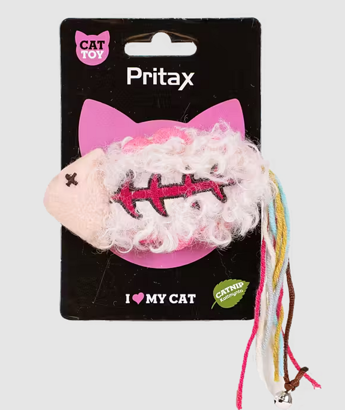 Kattleksak fiskeben med doft av kattmynta, lurvig och mjuk. Fisken har en svans av flera roliga snören, och i änden sitter en bjällra som gör leken lite mer spännande. Lagom storlek till kattunge, men passar även den vuxna katten.