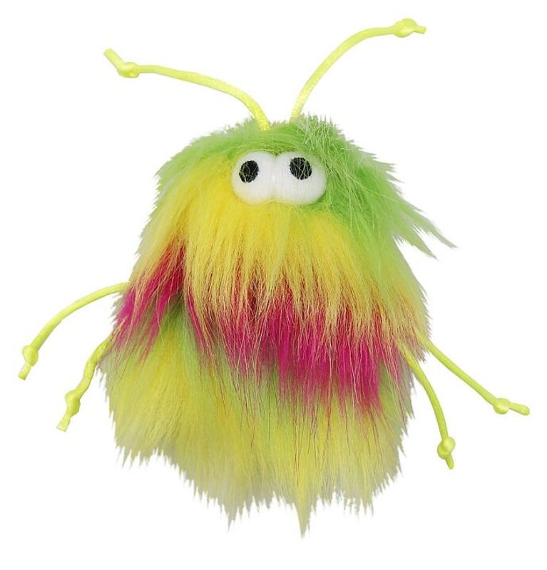 Skojjig kattleksak i färgerna gul, grön, vit och rosa. Detta fluffiga och snälla monster har sprattliga ben av snören, och är perfekt för katten att jaga och busa med - det väger inte så mycket och är lätt att smacka till med tassen och springa efter.