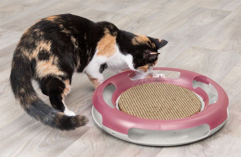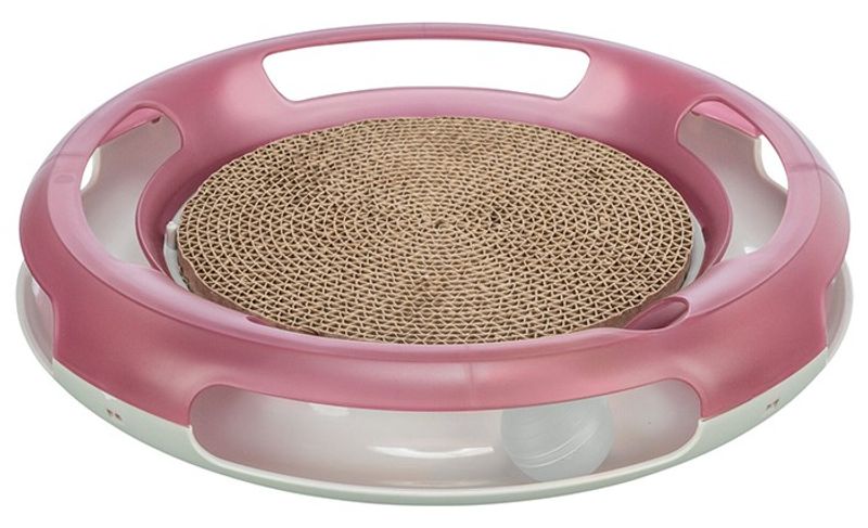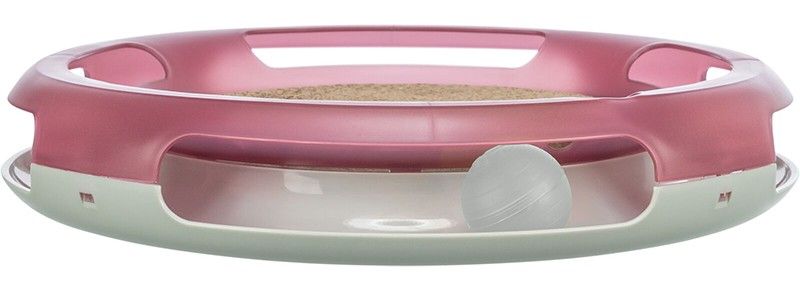 Stor och stadig bollbana med klösbräda till din katt, antiglid-undersida gör att den står stadigt under lek. Den gula bollen är delningsbar och i den kan man stoppa kattmynta, eller kanske något som rasslar roligt under lek!