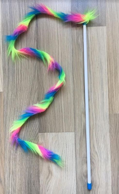 Härligt färgglad vippa i långhårig plysch med en pingla längst ut. Klassisk kattleksak med ett spö och en lång lurvig plyschsvans som lockar din katt till lek och jakt.