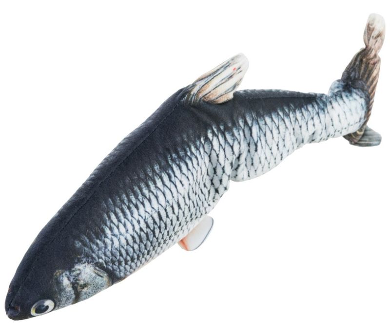En stor, riktigt fin, mjukisfisk med en rörelseaktiverad sensor som gör att fisken sprattlar vid beröring (den stoppar automatiskt efter 15 sekunder). Perfekt för din katt att brottas med, smyga på och göra "bunnykicks" med bakbenen. Vill man stänga av fisken så finns det en off-knapp, om din katt hellre leker med en fisk som inte rör på sig.