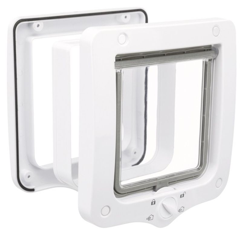 Klassisk kattlucka i vit färg med 4 olika lås-lägen, så kallad 4-vägs kattlucka. Tillverkad i plast med en mjukstängande, transparant svänglucka. Kattluckan har TPR-gummi som en list runt hela öppningen, samt ett magnetlås som gör att svängluckan inte slår i vinden.
