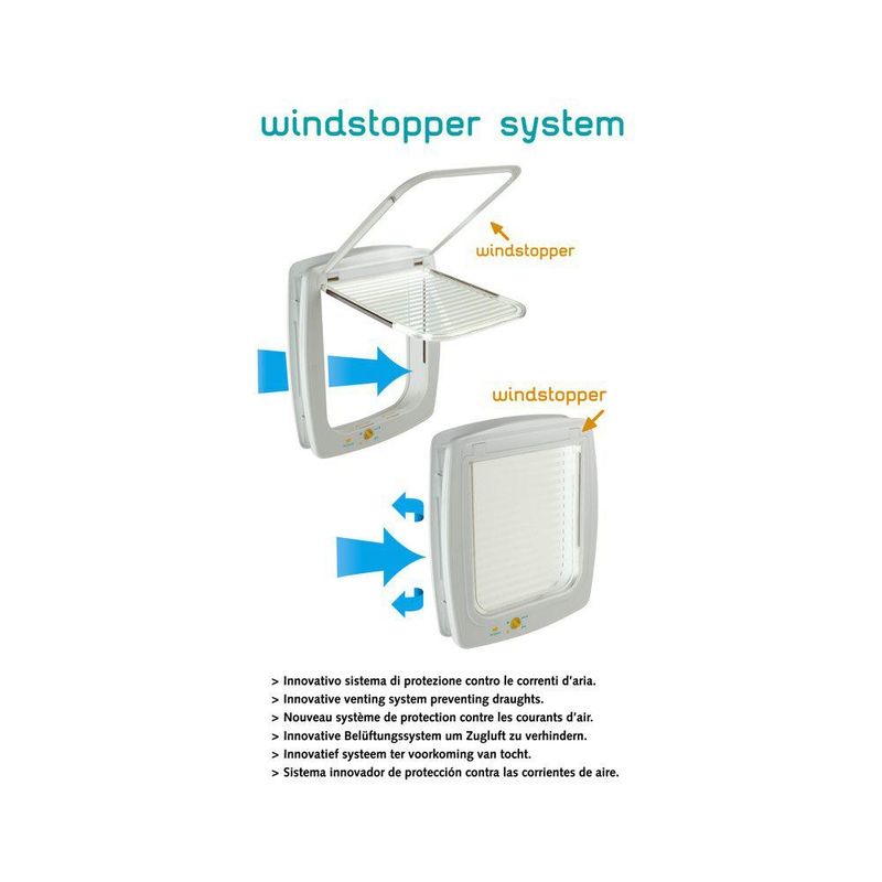Ferplast har ett eget skyddssystem mot drag, ett så kallad "Wind Stopper System" och dess 4-vägs stängning gör att du kan justera användningen av kattluckan efter behov: helt öppen i båda riktningarna, helt stängd i båda riktningarna, endast ingång eller endast utgång. Endast ingång men inte utgång kan vara en bra funktion om du t ex vet att ni har en veterinärtid att passa dagen efter.