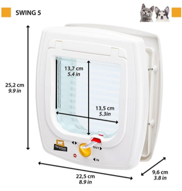 Swing 5 kan monteras på dörrar i trä-, metall- eller glasdörrar och på tegelväggar. Dörren är tillverkad av högkvalitativ plast (Ferplast kännetecken) och är pålitlig och praktisk att använda. Denna har modell har även "Last direction indicator" som visar om din katt senast passerade in eller ut, genom svängluckan.