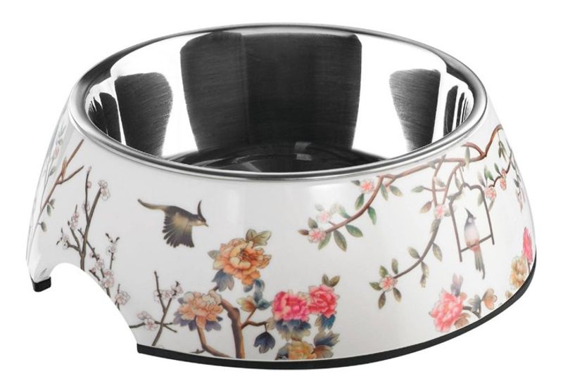 Denna snygga matskål, med motiv av blommor och fåglar, går att använda som både 1 och 2 matskål. Insatsen i rostfritt stål om 160 ml går lätt att lyfta ur för en omgång i diskmaskinen, den går även att använda som en helt separat matskål om man vill.
