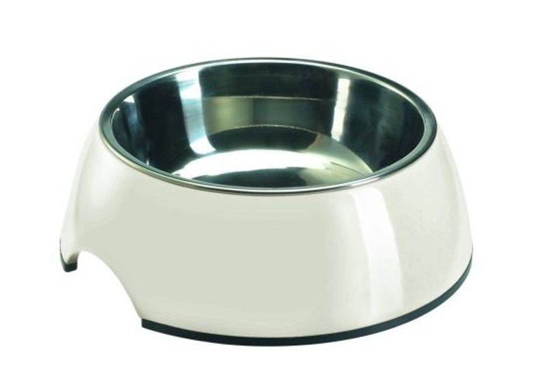 Först en snygg enfärgad skål och i denna en skål i tåligt rostfritt stål. Går att använda som en eller två skålar, det är även lätt att bara lyfta ur insatsskålen för en omgång i diskmaskinen