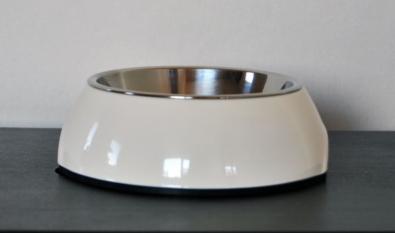 Först en snygg enfärgad skål och i denna en skål i tåligt rostfritt stål. Går att använda som en eller två skålar, det är även lätt att bara lyfta ur insatsskålen för en omgång i diskmaskinen