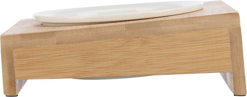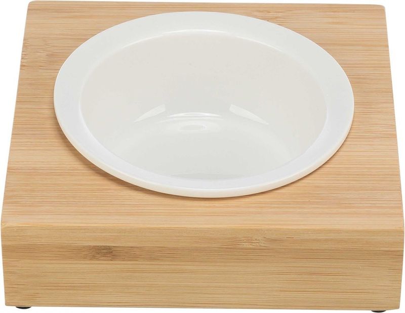 Den keramiska matskålen som ingår är designad för att passa perfekt in i bambustativet. Den vita keramikskålen är dessutom lätta att plocka upp för en omgång i diskmaskinen.