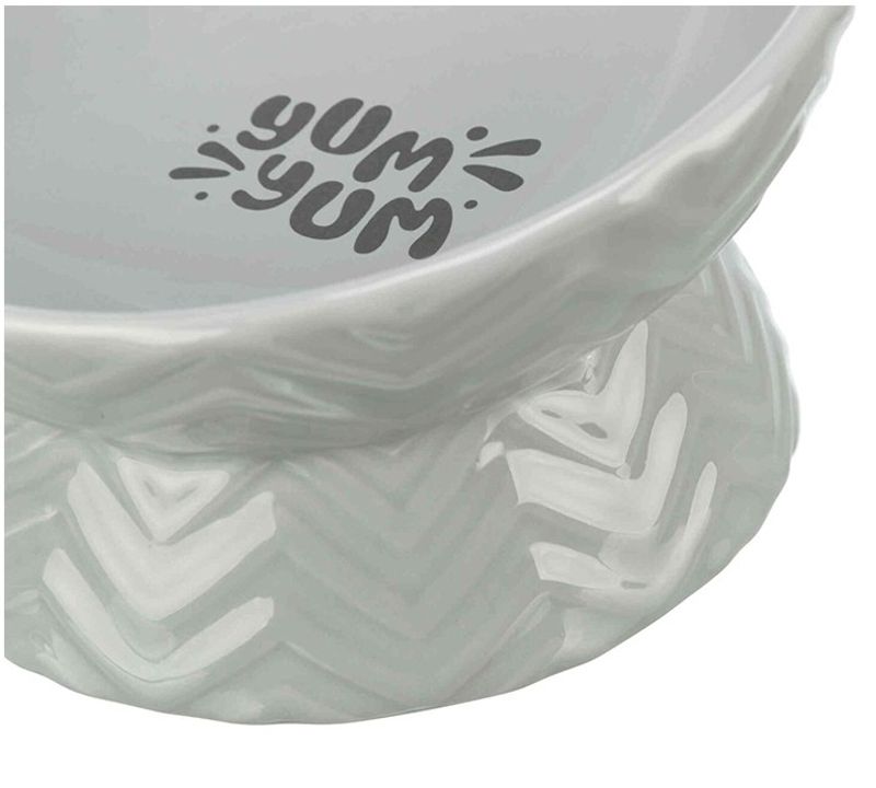 Grå kattmatskål med dekorativ yttersida samt "YUM YUM" tryckt i botten av skålen.