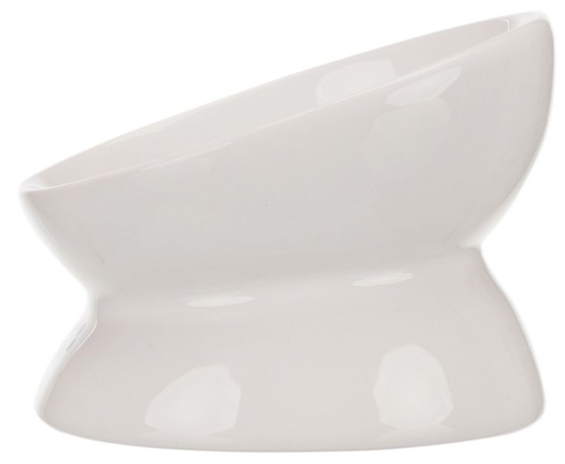 Superfin vit kattmatskål i keramik i ergonomisk design. En perfekt kattmatskål om du t ex har en äldre katt som pga ryggproblem eller artros i skuldror eller leder hellre vill äta ur en lite högre matskål.
