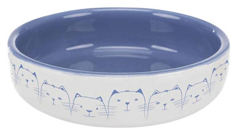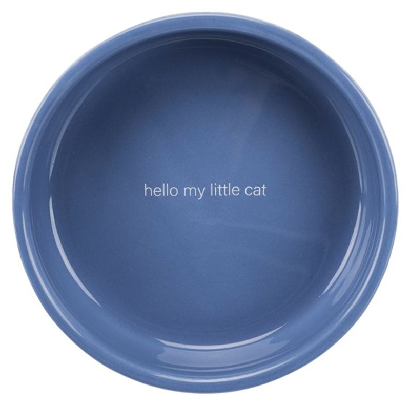 "Hello my little cat" står det på denna fina kattmatskål i keramik från märket Trixie. Blå och vit färg med fin dekorativ text i botten av skålen samt massa fina katter runtom kanten.
