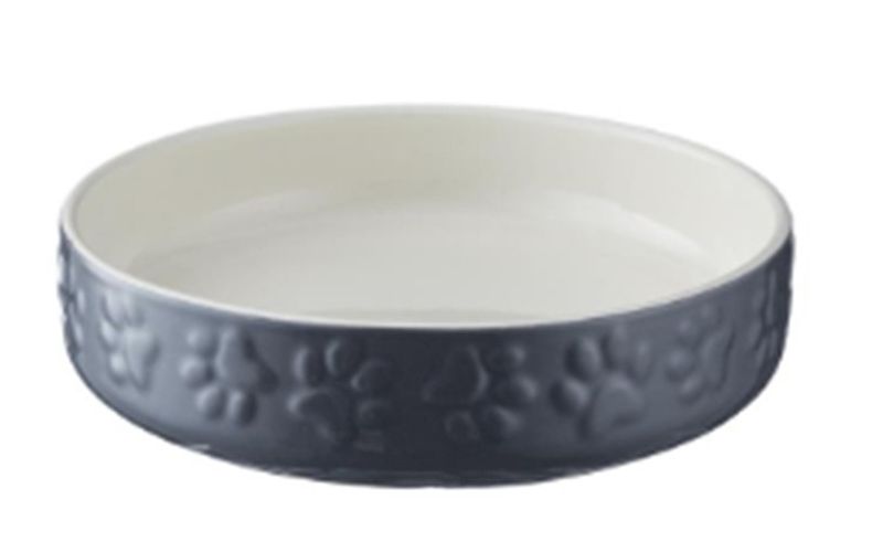 Beskrivning av Kattmatskål keramik låg kant grå