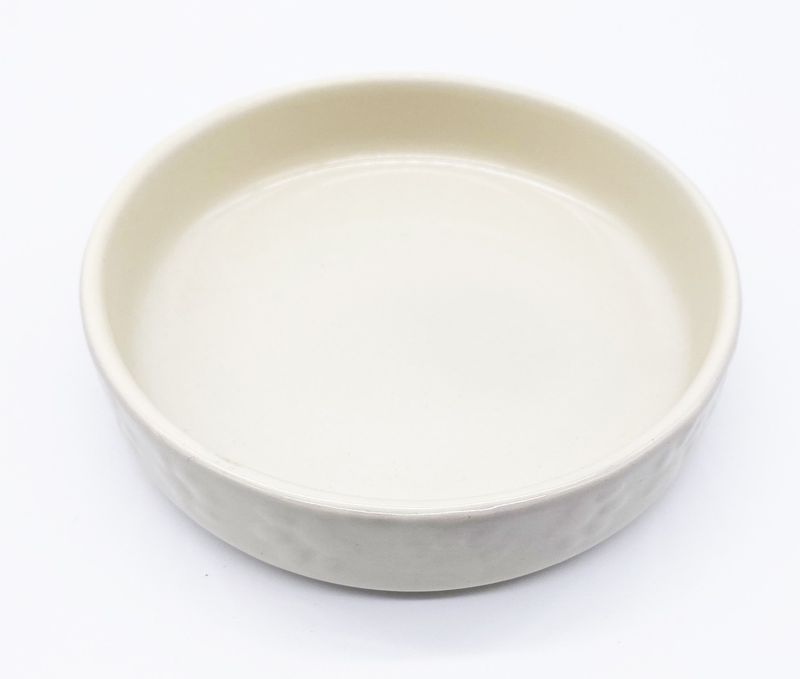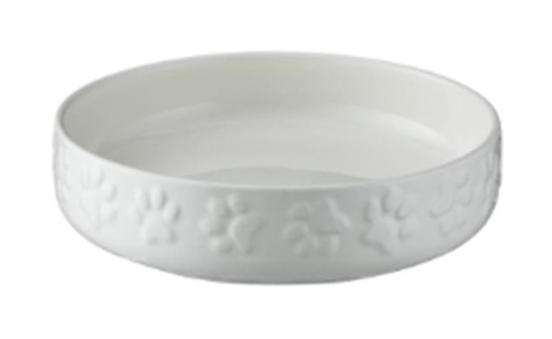 En jättefin kattmatskål i cremevit keramik med vit utsida, dekorativa "tassar" på utsidan av skålen. En funktionell matskål med extra låga kanter, så att de känsliga morrhåren ej tar i skålkanterna medan katten äter eller dricker.
