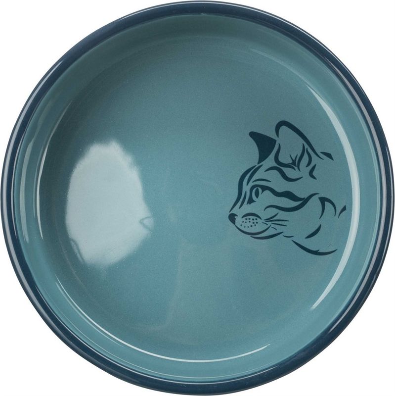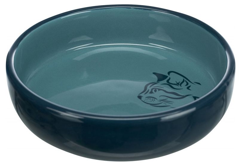 Beskrivning av Kattmatskål keramik med låg kant Petrol