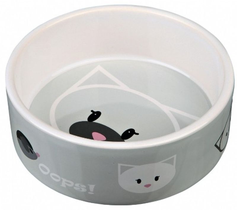 En riktigt fin till matskål i keramik till din katt. Fint motiv med katter i tre olika fäger att välja mellan; rosa, blå och ljusgrå.