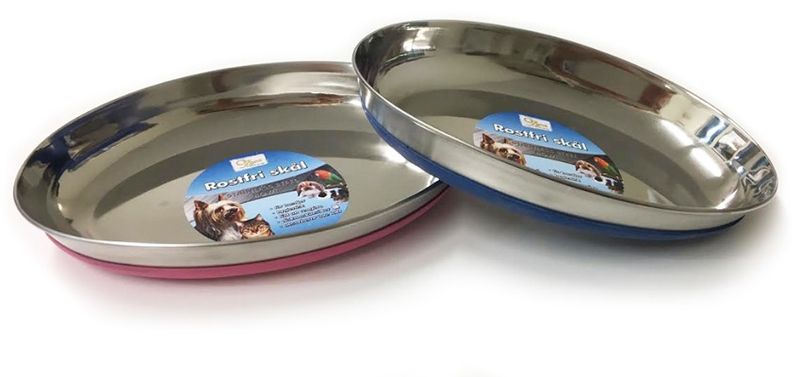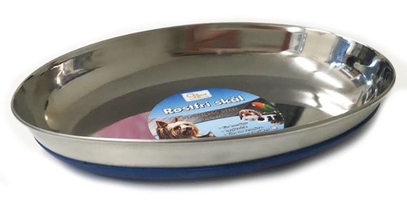 Klassisk kattmatskål eller vattenskål i rostfritt stål och låg kant. Både den ovala formen på skålen samt den låga kanten gör det bekvämt för katten när den kan äta utan att de känsliga morrhåren slår i skålens kanter. Gummerad undersida, i blå färg, så skålen hålls på plats och ej styrs omkring på golvet.