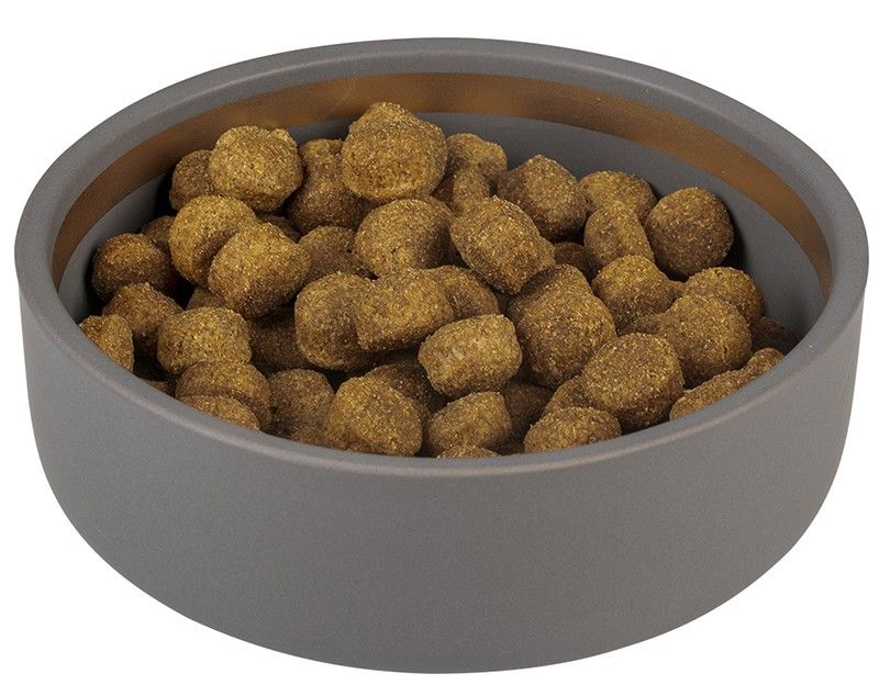 Kattmatskål tillverkad i stengods, bränd lera, ger en  stark och stabil kattmatskål. Den har en mycket fin grå färg, med dekoration på insidan av skålen, den passar både till kattens torrfoder och våtfoder. Den högkvalitativa glasyrfinishen gör att denna skål även tål vätska, därmed kan den användas som vattenskål, och den tål även maskindisk - praktiskt i vardagen. Det gillar vi!