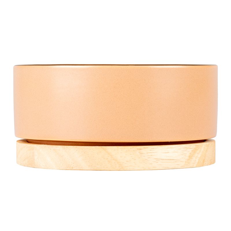 Elegant och stabil kattmatskål i keramik med dekorativ träbas. Stone Timber i rosa färg kombinerar funktion och stil, en dekorativ kattmatskål som pryder sin plats i hemmet och gör kattens matplats extra piffig.