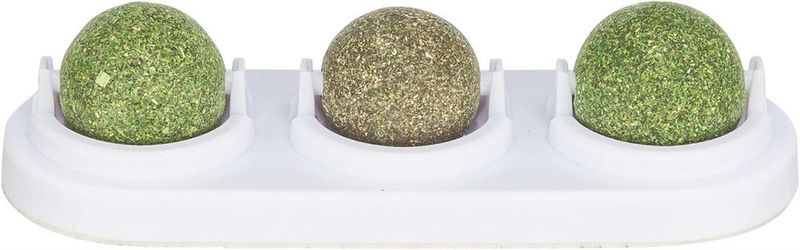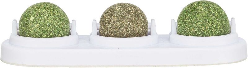 Gillar din katt kattmynta och matatabi? Då kanske denna kattleksak kan vara något för er? Två stycken hårdpressad boll av örten kattmynta som sitter fast i en hållare, plus en bonusboll med torkad matatabi. Denna hållare har självhäftande lim på baksidan så att du kan sätta upp den på en slät yta i hemmet. Därifrån kan din katt slicka på och gnugga sig mot bollarna.
