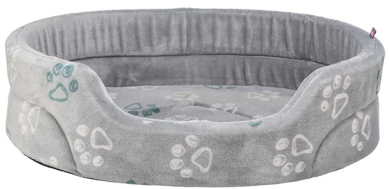 En klassisk kattsäng (eller hundsäng) i ljusgrå plysch. Detta är en bädd med mindre stoppning, den är perfekt för katten som inte gillar alltför mjuka sängar.