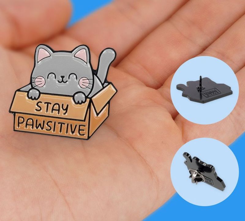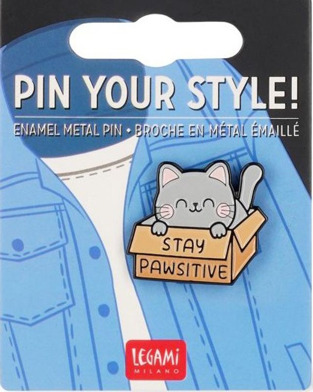 Snygg pin (knappnål) i Meow-serien - med sött kattmotiv och ett positivt budskap "Stay Pawsitive". Tillverkad av metall med tydliga färger och glansig yta.