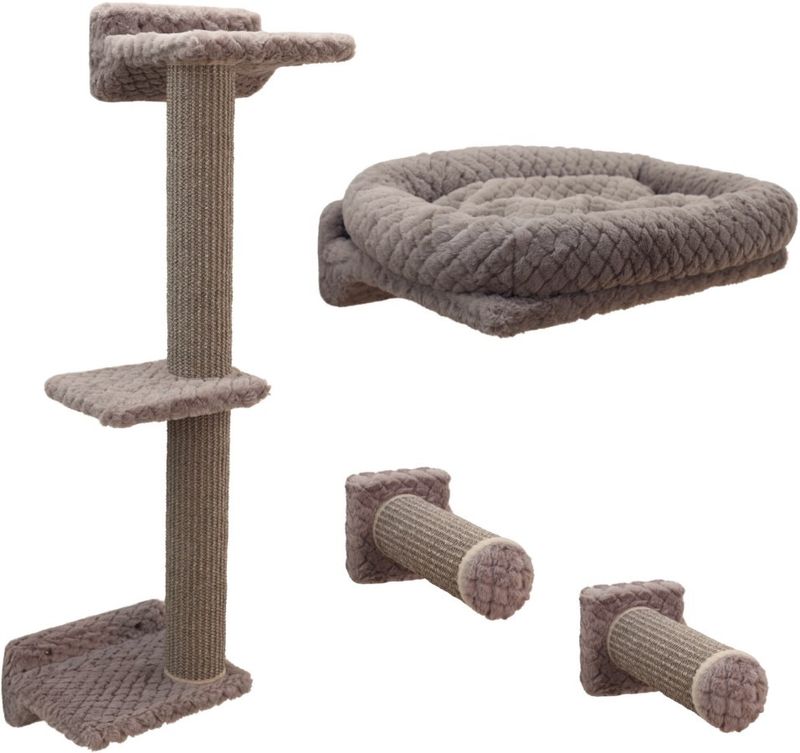 Möbeln bjuder på två klöspelare i slitstark sisalmatta, flera avsatser att hoppa mellan och en mysigt kattsäng där katten kan spana eller vila i lugn och ro. Alla andra ytor är mjukt klädda i beige plysch för hög komfort.