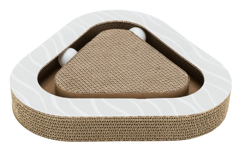 Liten och lätt klösbräda i kartong och wellpapp som inbjuder till lek. Klösbrädan har bana runtom med 2 roliga bollar och en liten påse kattmynta medföljer.