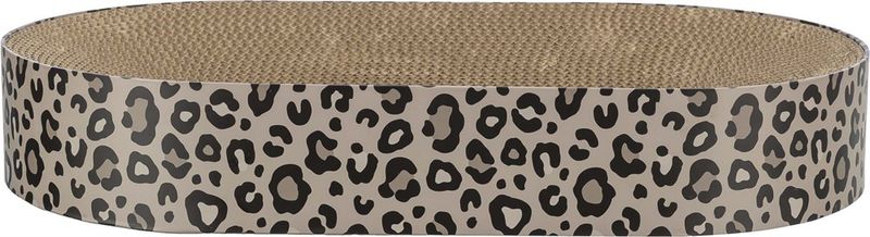 En klösbräda i papp, med snyggt leopard-mönster på långsidorna.