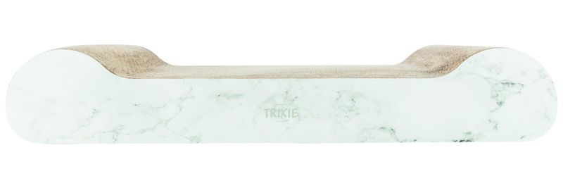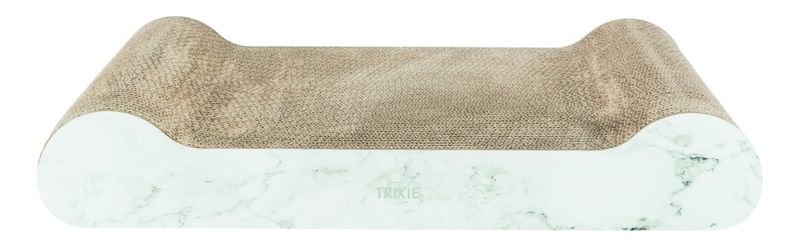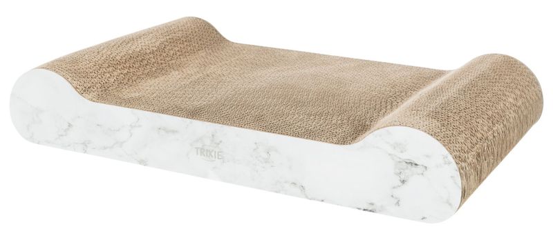En klösbräda i papp, med snyggt marmor-mönster på långsidorna. En klösbräda som gör sig snygg i hemmet och fungerar toppen som både sovplats och klösbräda.
