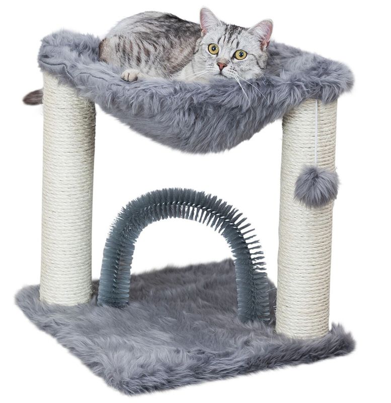 Baza är en populär klösmöbel i en lite mindre modell, den passar perfekt för både kattungar såväg som vuxna katter. Denna nya variant av Baza har ett långhårigt lurvigt grått plyschtyg, samt en massagebåge nertill där din katt kan stryka sig, klia sig och kanske tugga lite!