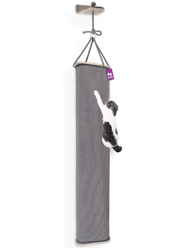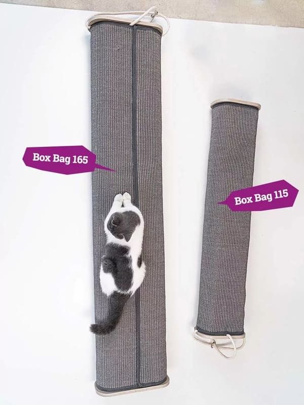 Box Bag 165 Grey är en väggmonterad XL-klättersäck för katter som älskar att klättra, klösa och utforska. Den är täckt med slitstark grå sisalmatta, vilket gör den perfekt för aktiva katter.