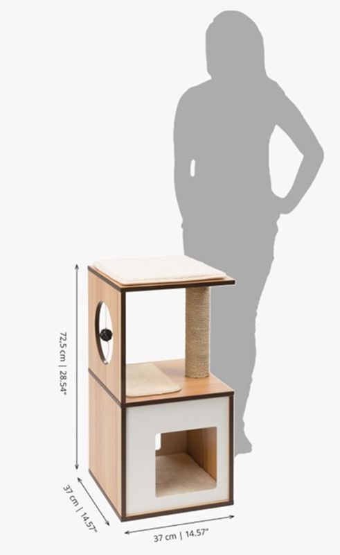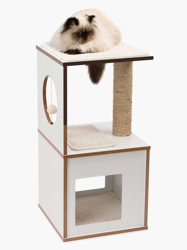 Vesper Box i vit färg, är en kompakt kattmöbel med modern design som verkligen gör sig fin med hemmets inredning. Klösmöbeln är utrustad med en mysig kub i botten, viloplatser och en klösstolpe. Kuben är perfekt för catnaps och den är designad med 2 ingångar så att din katt inte ska känna sig trängd.