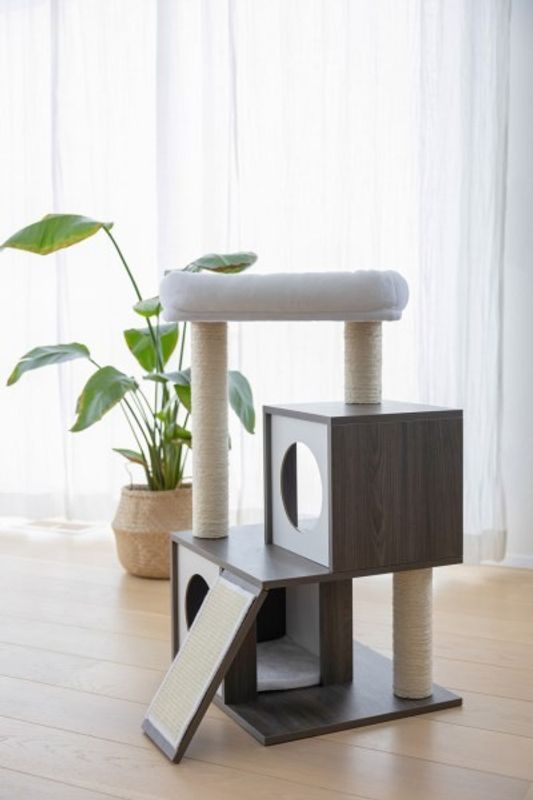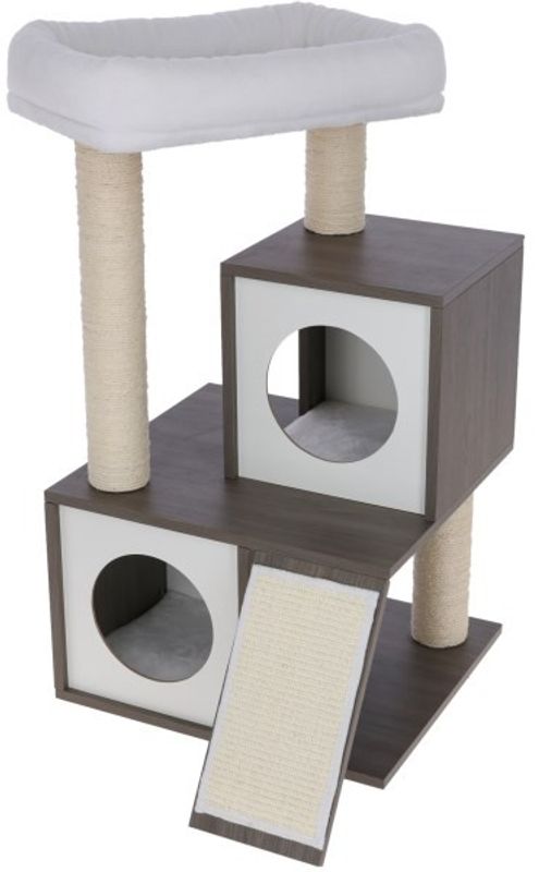 Människorna uppskattar möbelns stilrena design, med mörk MDF-faner med vita detaljer, ljusa klöspelare och tygdelar i vit plysch. Det här är ett katträd som passar fint in i det moderna hemmet.