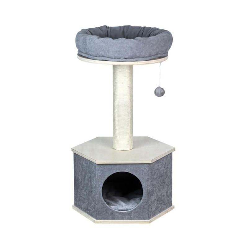 Kuma 1 från Nordic Paws är ett elegant och robust mindre klösträd som kombinerar lek, vila och klösmöjlighet i ett. Det har en stadig bas, en tålig klöspelare lindad med sisalrep och en mysig bädd med mjuk, vadderad kudde - perfekt för sköna kattlurar och för att hålla uppsikt över reviret.