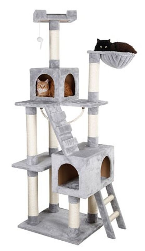 Klösträd med fin ljusgrå plysch och pelare lindade med sisalrep. Flera spännande lek- och sovplatser. Mjuka sovplatåer, mysig hammock och hemliga grottor att busa i.