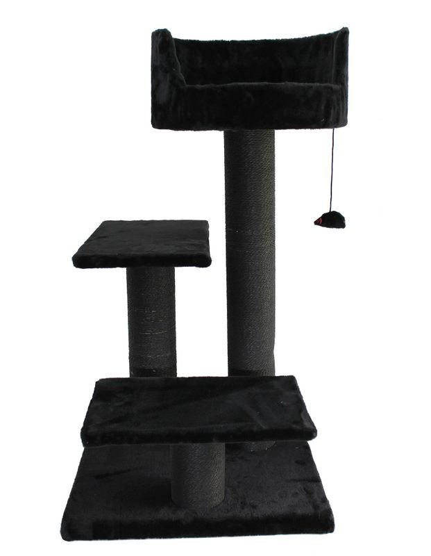 Snyggt, enkelt och stilrent klösträd till din katt med både svart plysch samt svart sisalrep runt klösstolparna. Tre stycken avsatser gör att även den äldre katten eller kattungen tar sig upp till den högsta liggplatsen, då kan man vrida toppsängen så att "urtaget" vid översta sängen är vänd mot den översta hyllan så att i- och urstigning blir enklare.