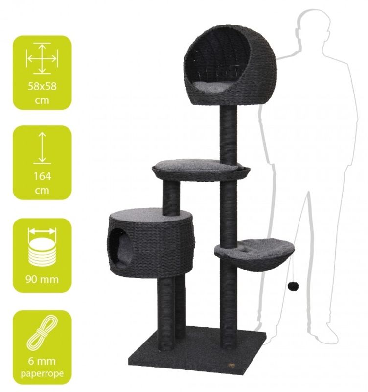Mycket fint och stilrent klösträd till din katt i svart rotting med svarta sisalpelare för klösmöjligheter. Två mysiga sovplatser/spanarplatser och två mysig kojor i bra höjd. Gör sig riktigt bra i hemmet!