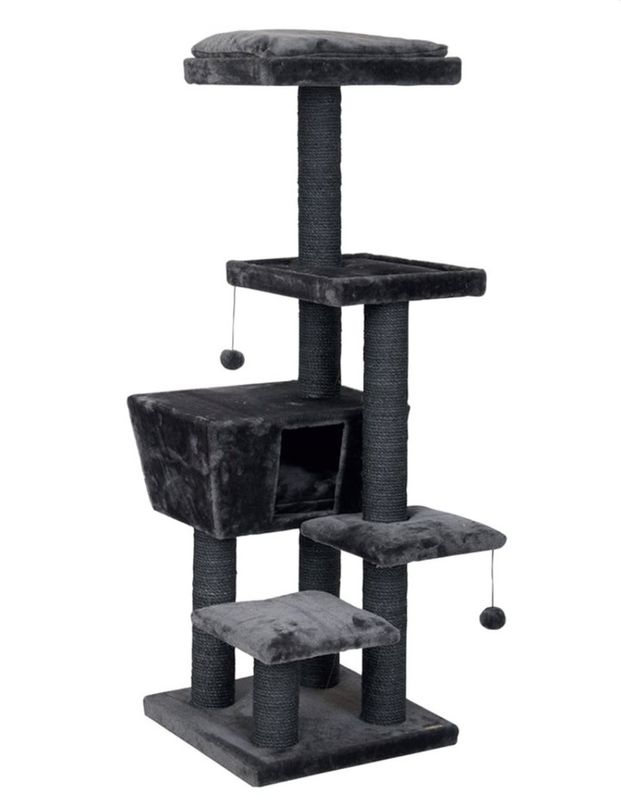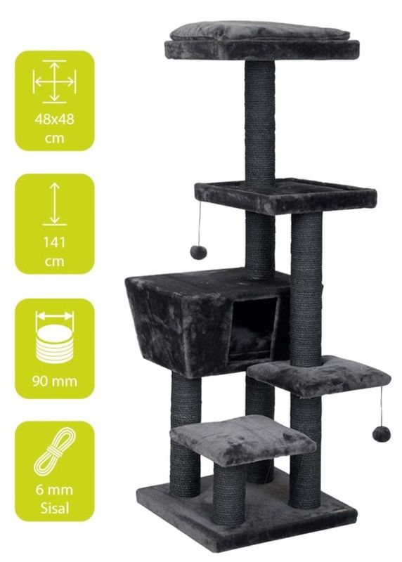 Jättefint klösträd i färgen Antracit (mörkgrå) med 4 hyllor och ett mysigt krypin. Klösträdet har bra materialval, bland annat ett extra tätt plyschtyg av bra kvalitet.