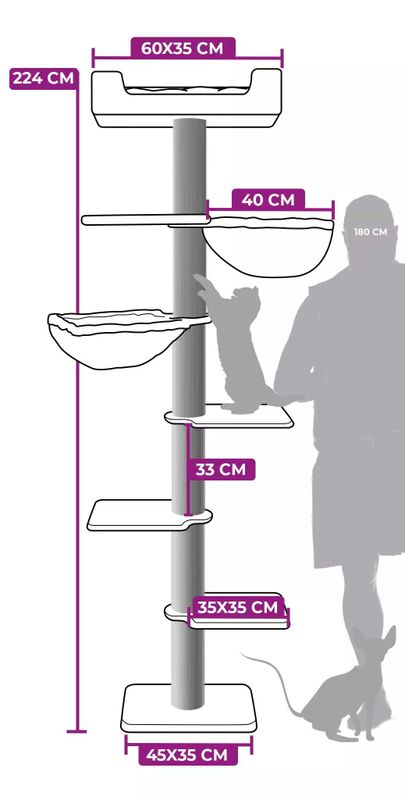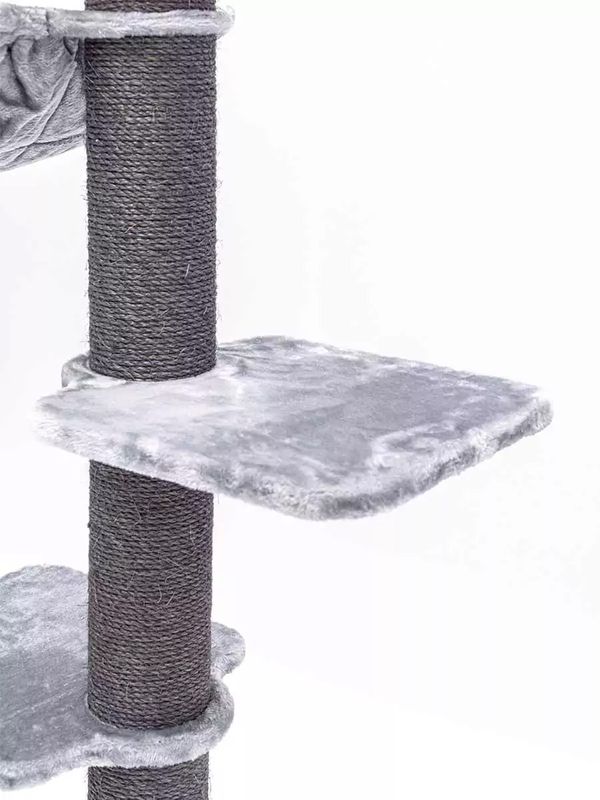 Det här extra höga klätterträdet är en rolig klätterställning för aktiva och äventyrliga katter som gillar att klättra högt. Många katter älskar att sova högt upp, där de kan ha span på sitt revir samtidigt, så de övre hängmattorna brukar vara riktigt populära sovplatser.