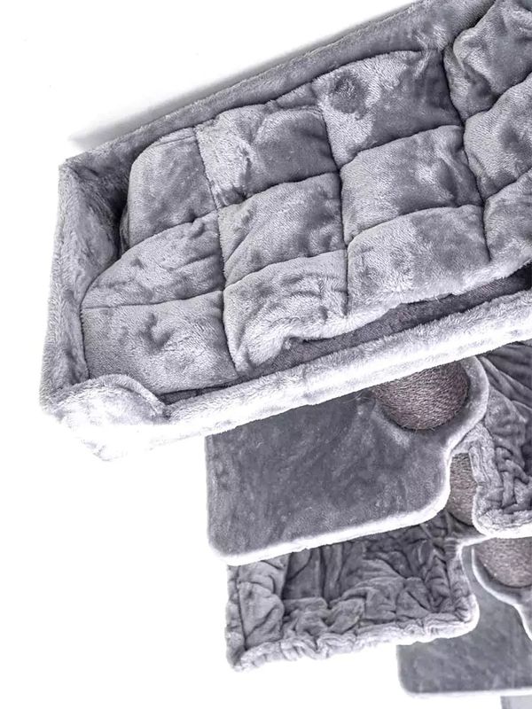 Alexis har 7 st viloplatser till dina katter. Fyra plana hyllor, två av PetRebels lyxiga och stora hängmattor och en superdeluxe sovhylla med kant och kudde högst upp.
