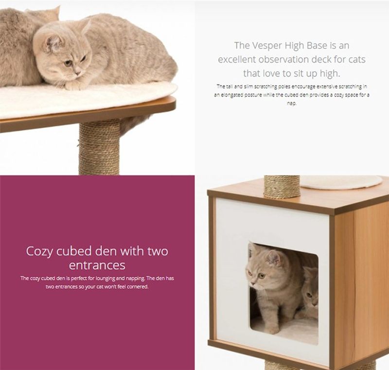 Vesper High Base är en klösmöbel med modern design som passar fint i hemmet. Klösträdet har tre nivåer för spaning ut över reviret och en mysig kub där din kisse kan ta sin catnap. Kuben är designad med 2 ingångar så att din katt inte ska känna sig trängd.