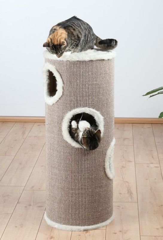 Toppenfin klöstunna till katten med fyra krypin att leka och mysa i. Tunnan är klädd med beige klösvänlig sisal, och har vitt lurvigt plysh inuti och på toppen. En klöstunna är både snygg i hemmet och populär bland katterna - sovplatsen högst upp brukar bli väldigt omtyckt.