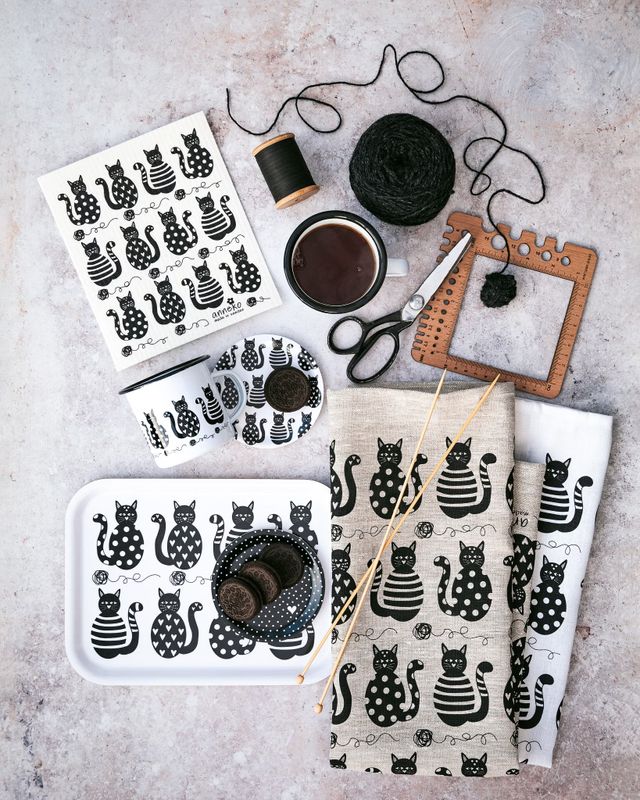 Piffig kökshandduk med det härliga kattmotivet från AnnEko design. Kökshandduken är tillverkad i 100% linne och tvättäkta i 60°C. Den är tryckt med vattenlöslig och miljövänlig färg och blir din kökskompis i många år!