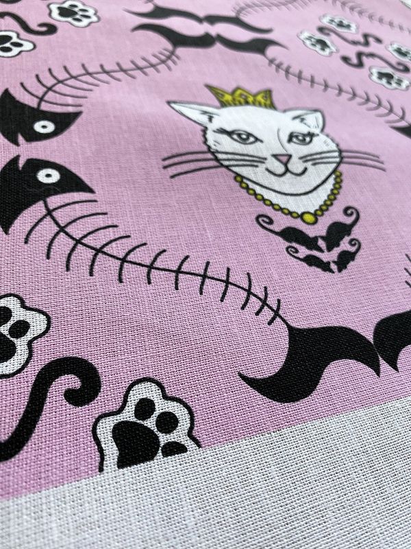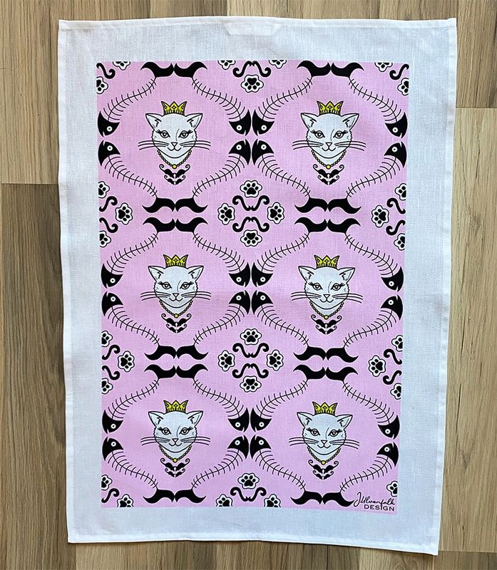 En helt fantastiskt fin och stor kökshandduk, med mönstermotivet Queenie som Jenni Ulvenfalk har designat. En fin drottning med krona och pärlhalsband på rosa bakgrund.
