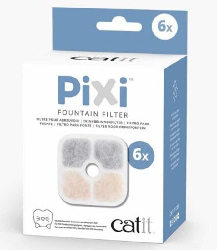 Catit PIXI aktivt kolfilter renar vattnet i fontänen från partiklar, smuts, päls från djur (katthår och hundhår) samt sådant som bidrar till dålig lukt. Detta filter kan även mjuka upp ett spå kallat "hårt vatten" som kan ge kalkavlagringar i fontän och motor.